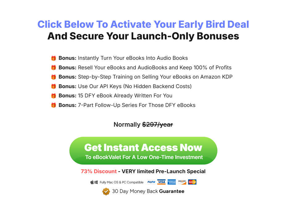 The value is great at the one-time launch price. It grants access to digital publishing never before possible. eBook Valet is a must if you’re a reader of eBooks or audiobooks. It’s awesome for generating leads or kicking off a publishing brand.