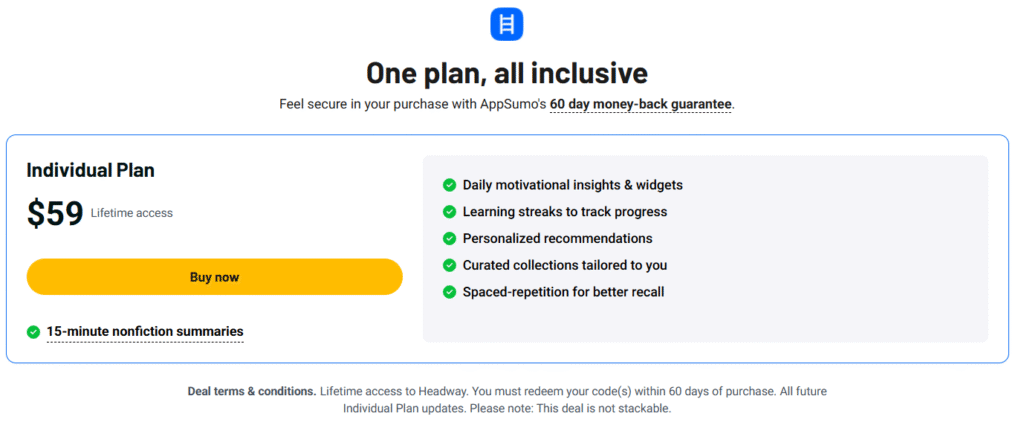 The app helps you learn. It provides concise summaries, valuable insights, and practical tools. These resources encourage you to read and learn more about the topic. That’s Headway in a nutshell. Keep in mind the best book strategies to meet your goals—in under 15 minutes a day. This summary outlines how you can utilize the $59 lifetime deal to support your long-term growth and development