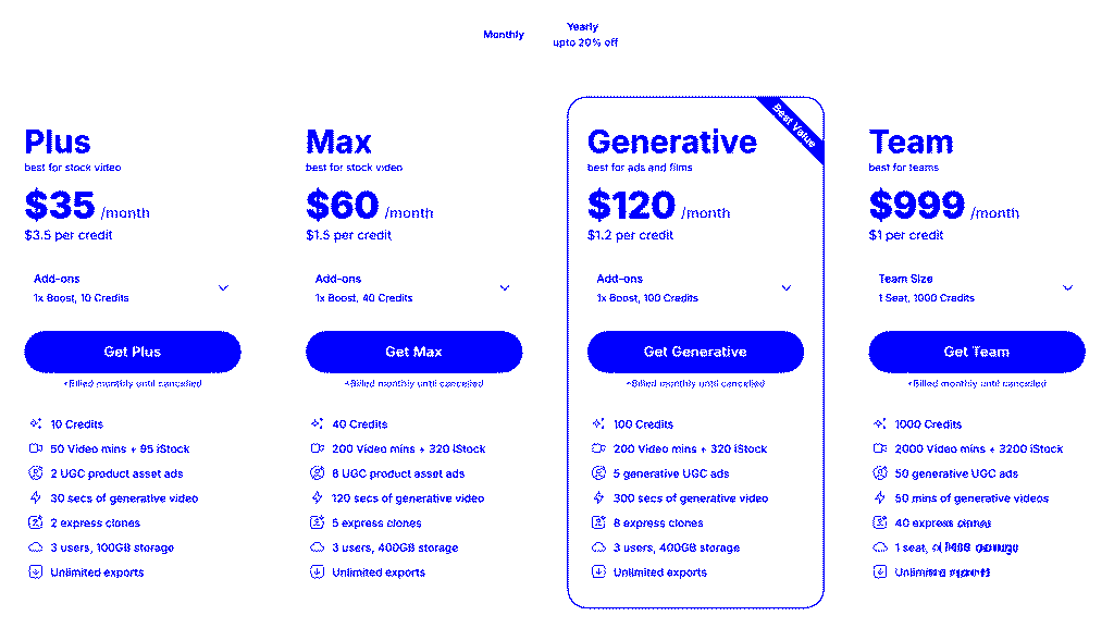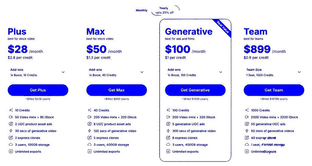 InVideo AI offers flexible pricing (monthly/yearly, up to 20% off annually). All include unlimited exports, but vary in credits (for generations), video mins, and storage.